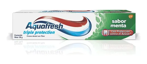 AQUAFRESH SABOR MENTA es un producto de higiene bucal que contiene una formulación diseñada para la limpieza y cuidado dental. Su composición principal incluye ingredientes que contribuyen a la higiene oral. Se presenta en forma de pasta dental, adecuada para el uso diario. El producto se encuentra disponible en un envase de 126 gramos. Es importante seguir las recomendaciones de uso y consultar con un profesional de la salud en caso de dudas o efectos adversos. Se recomienda mantener fuera del alcance de los niños y evitar el contacto con los ojos. El producto no debe ser ingerido y debe usarse conforme a las instrucciones del etiquetado. Consulte a su médico o químico farmacéutico.