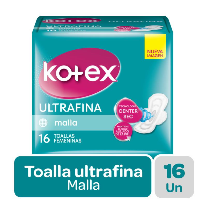 Composición principal: materiales absorbentes. Presentación: paquete de 16 toallas femeninas.